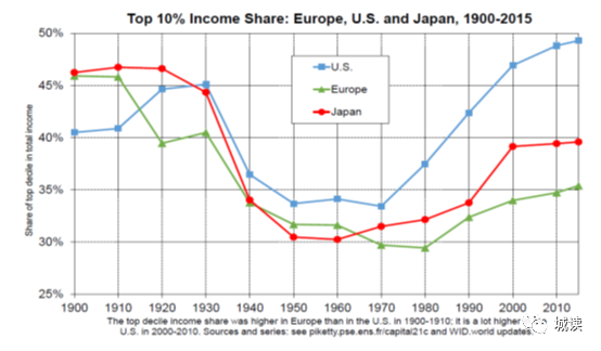 圖1:美國(guó)與西歐收入差距變動(dòng)