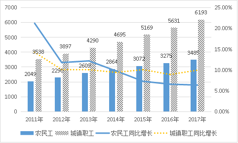 數(shù)據(jù)來源:根據(jù)《2011—2017年度人力資源和社會(huì)保障事業(yè)發(fā)展統(tǒng)計(jì)公報(bào)》《2011—2017國(guó)家統(tǒng)計(jì)局農(nóng)民工監(jiān)測(cè)調(diào)查報(bào)告》整理