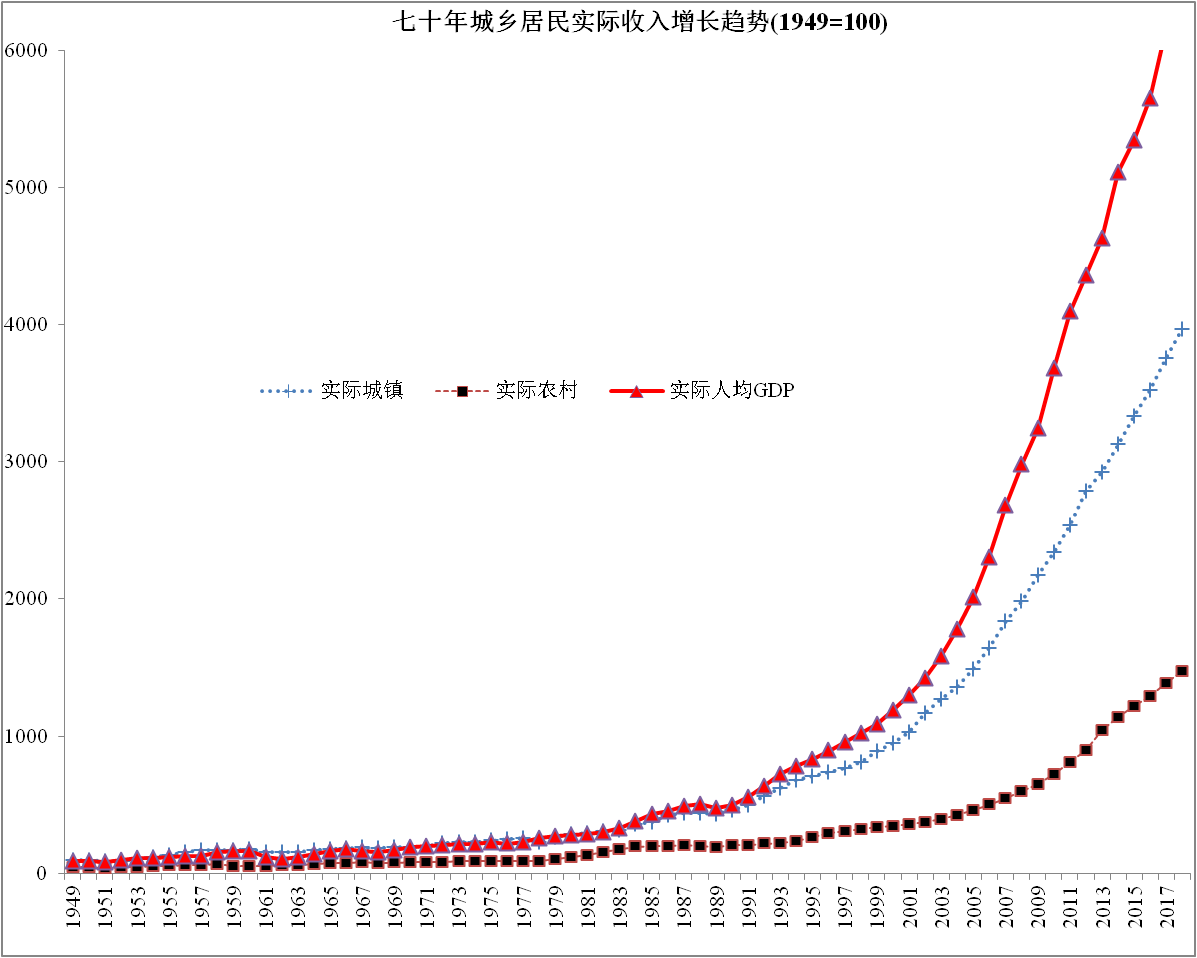 圖5:70年來城鄉(xiāng)居民實(shí)際收入增長(zhǎng)趨勢(shì)