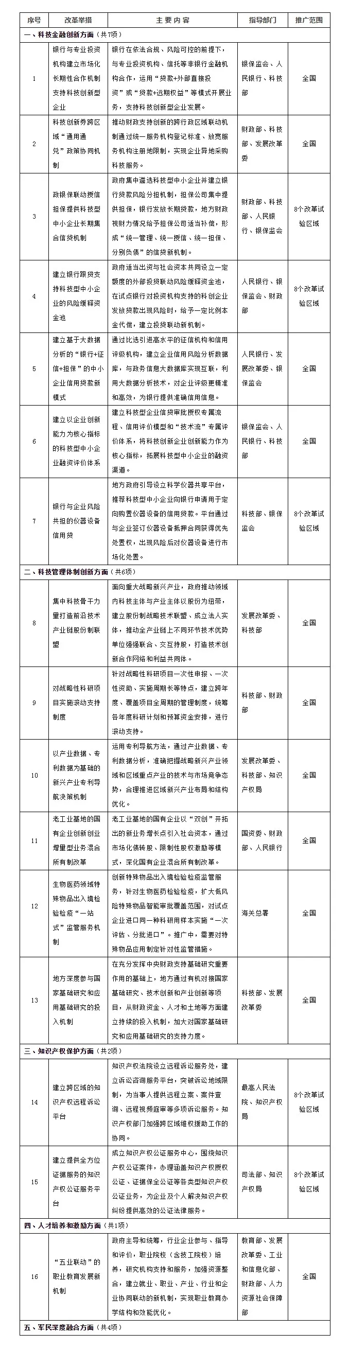 本次正式發(fā)布的20項(xiàng)改革舉措,是繼2017年首批13項(xiàng)、2018年第二批23項(xiàng)之后,由國(guó)辦發(fā)布的第3批向全國(guó)或在8個(gè)試驗(yàn)區(qū)域范圍內(nèi)復(fù)制推廣、支持創(chuàng)新的改革舉措,涵蓋了科技金融創(chuàng)新、科技管理體制創(chuàng)新、知識(shí)產(chǎn)權(quán)保護(hù)、人才培養(yǎng)和激勵(lì)和軍民深度融合5個(gè)重點(diǎn)領(lǐng)域。根據(jù)我們觀察分析,經(jīng)過(guò)了前期的沉淀,以及進(jìn)一步的實(shí)踐探索,改革進(jìn)一步走向“深處”和“實(shí)處”,這批舉措緊密呼應(yīng)當(dāng)前中央的重要改革關(guān)切,充分體現(xiàn)了“實(shí)”和“新”,在一些改革的“老大難”問(wèn)題上進(jìn)一步破題。