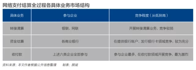 把支付結(jié)算作為一個完整業(yè)務(wù)來看,各個環(huán)節(jié)、各企業(yè)交織在一起,競爭力量有較大差距。