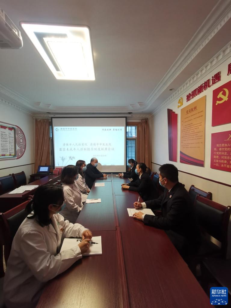 12月16日,貴州省清鎮(zhèn)市檢察機關(guān)與醫(yī)療機構(gòu)召開聯(lián)席會議,研究推進醫(yī)療機構(gòu)落實侵害未成年人案件強制報告制度。新華社發(fā)(杜遠敏 攝)