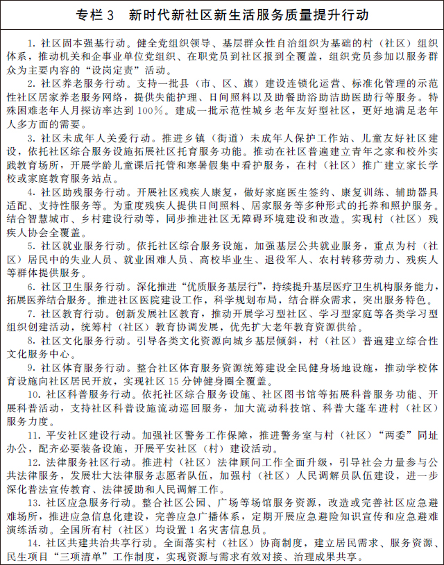 全面推進(jìn)城市一刻鐘便民生活圈建設(shè),加快推進(jìn)農(nóng)村生活服務(wù)便利化。引導(dǎo)市場(chǎng)、社會(huì)力量發(fā)展社區(qū)托育、養(yǎng)老等服務(wù)業(yè)態(tài)。推動(dòng)物流配送、快遞、再生資源回收網(wǎng)點(diǎn)設(shè)施輻射符合條件的村(社區(qū)),鼓勵(lì)發(fā)展社區(qū)物業(yè)、維修、家政、餐飲、零售、美容美發(fā)等生活性服務(wù)業(yè),支持相關(guān)企業(yè)在村(社區(qū))設(shè)置服務(wù)網(wǎng)點(diǎn),滿足居民多樣化需求。鼓勵(lì)有條件的地方引進(jìn)專業(yè)化物業(yè)服務(wù),建立健全業(yè)主和物業(yè)服務(wù)企業(yè)雙向選擇機(jī)制。完善城市居民委員會(huì)組織體系,指導(dǎo)和監(jiān)督業(yè)主委員會(huì)、物業(yè)服務(wù)企業(yè)依法履行職責(zé)。依托村級(jí)綜合服務(wù)設(shè)施、供銷合作社等強(qiáng)化農(nóng)村地區(qū)農(nóng)產(chǎn)品收購(gòu)、農(nóng)資供應(yīng)等服務(wù)供給。