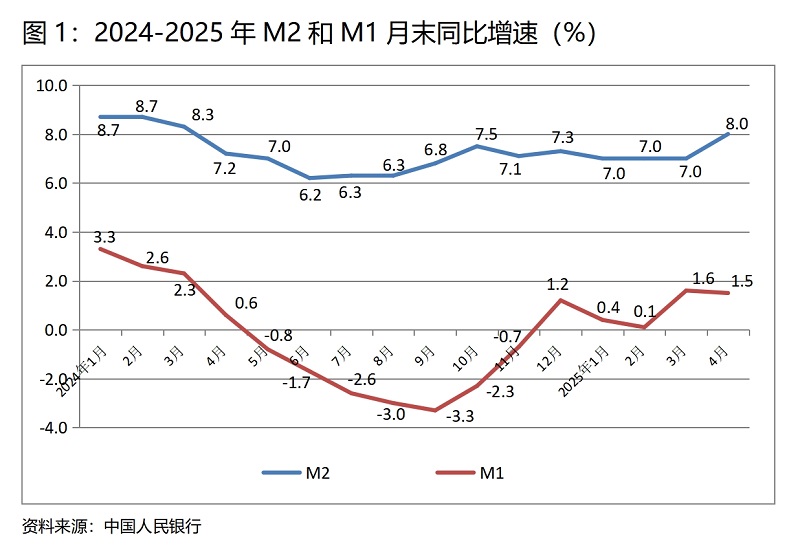 (一)M2增速由平轉(zhuǎn)升。4月末,廣義貨幣供應(yīng)量(M2)同比增長8.0%,比3月末增長7.0%回升1.0個百分點,實際上這是在今年前三個月末連續(xù)保持7.0%增速基礎(chǔ)上的回升;狹義貨幣供應(yīng)量(M1)增速比上月略有回落,4月末同比增長1.5%,比3月末增長1.6%回落0.1個百分點,而3月末增幅比2月末增幅回升1.5個百分點;流通中貨幣(M0)增速由升轉(zhuǎn)落,4月末同比增長12.0%,比3月末增長11.5%回升0.5個百分點,而3月末增速比2月末增速回升了1.8個百分點。貨幣政策正按照適度寬松的要求運行,這對推動經(jīng)濟回升將發(fā)揮積極作用,但各層次貨幣供應(yīng)量增速較大差異反映出的問題需引起關(guān)注。