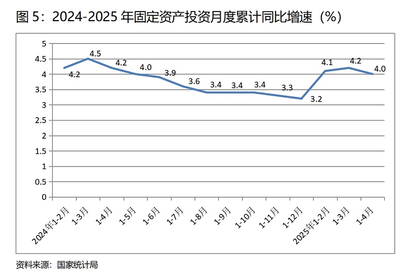 (五)投資增速由小升轉(zhuǎn)小落。1-4月份,固定資產(chǎn)投資同比增長4.0%,比1-3月份增長4.2%回落了0.2個百分點,1-3月份增速比1-2月份回升了0.1個百分點。1-4月份國有控股投資同比增速比1-3月份回落0.3個百分點;民間投資回落了0.2個百分點。三次產(chǎn)業(yè)投資中,第一產(chǎn)業(yè)投資增速回落2.8個百分點,第二產(chǎn)業(yè)投資增速回落0.2個百分點,第三產(chǎn)業(yè)投資增速由1-3月份增長0.1%轉(zhuǎn)為下降0.2%。民間投資和第三產(chǎn)業(yè)投資增長仍比較緩慢。