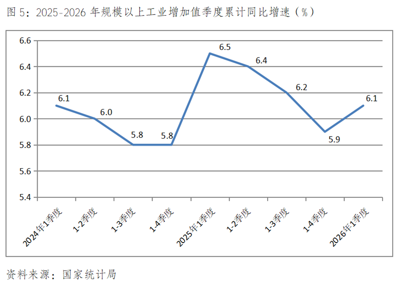 (一)工業(yè)生產(chǎn)增速比上年全年回升,比上年同期回落。一季度規(guī)模以上工業(yè)增加值同比增長6.1%,比上年全年增長5.9%回升0.2個(gè)百分點(diǎn),比上年同期增長6.5%回落0.4個(gè)百分點(diǎn)。與上年同期相比,一季度采礦業(yè)同比增長6.0%。比上年同期增長6.2%回落0.2個(gè)百分點(diǎn);制造業(yè)增長6.4%,比上年同期增長7.1%回落了0.7個(gè)百分點(diǎn);電力、熱力、燃?xì)饧八a(chǎn)和供應(yīng)增長4.3%,比上年同期增長1.9%回升了2.4個(gè)百分點(diǎn)。